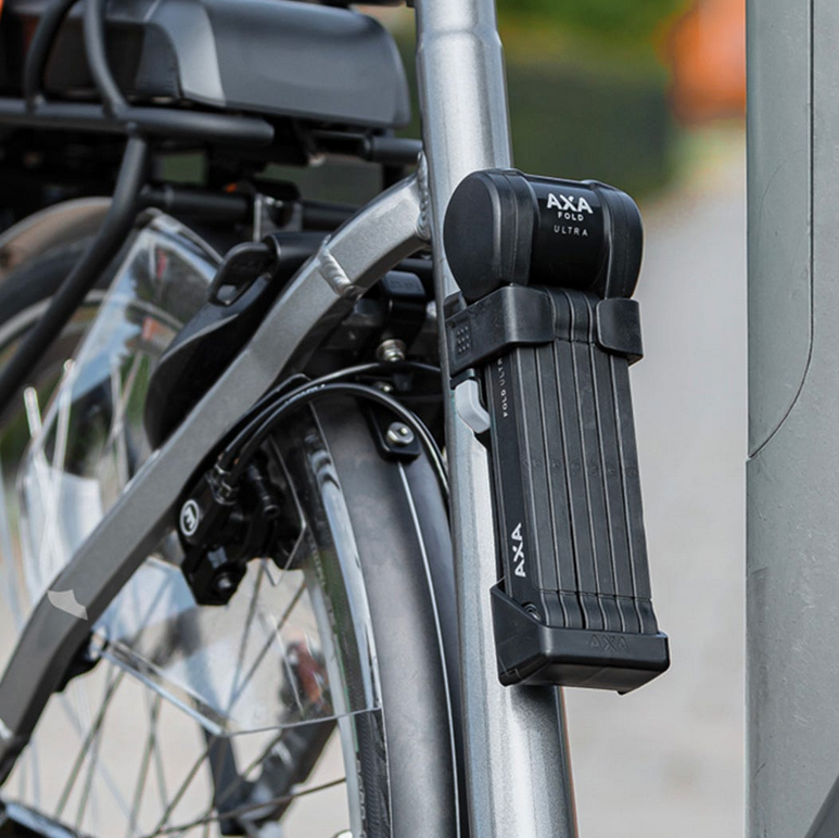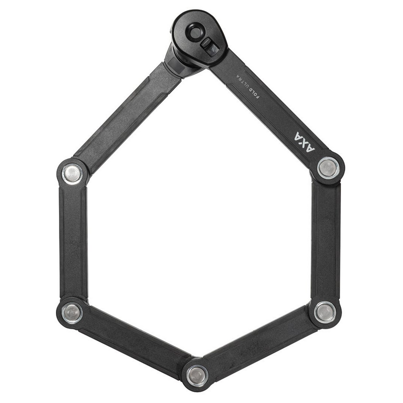 AXA:n kätevä linkkulukko runkokiinnikkeellä. Lukittuu telineeseen automaattisesti, joka helpottaa lukon käsittelyä.